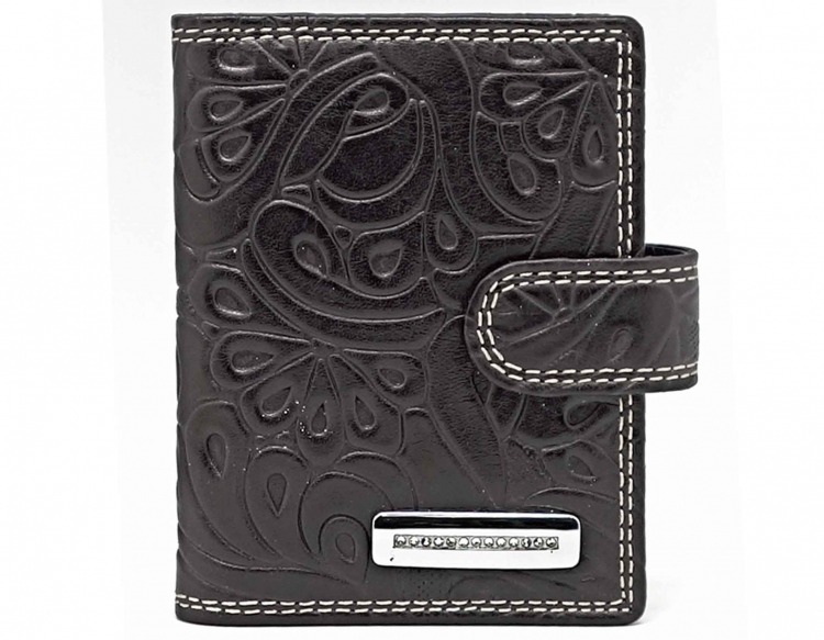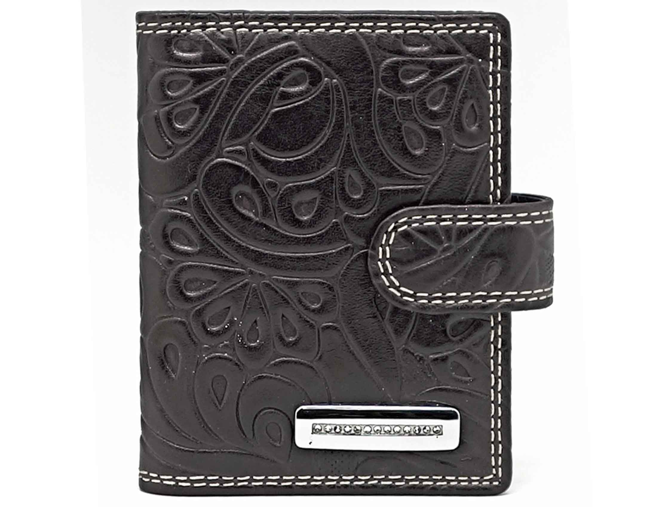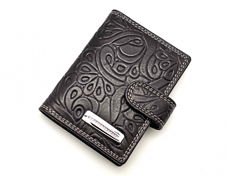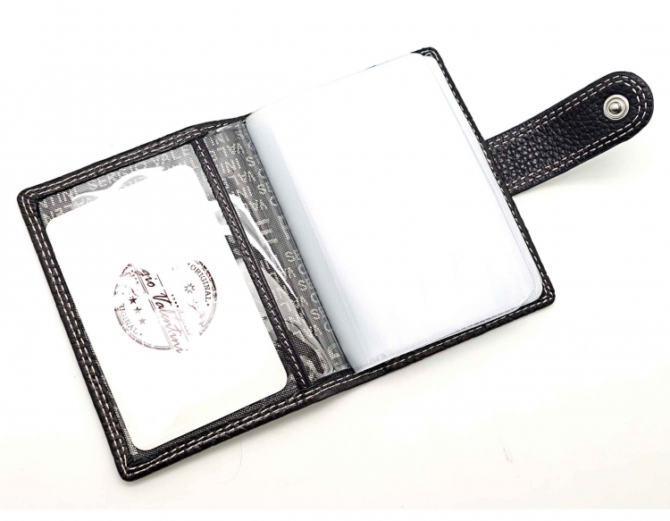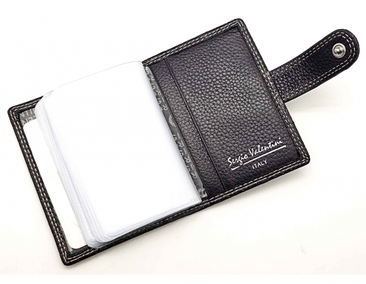 Изготовлено из тиснёной кожи тёмно-синего цвета. Размер: 8 х 10,5 см. Закрывается на хлястик с кнопкой. Внутри: 24 прозрачных пластиковых файла для карточек, текстильная подкладка с логотипом и прозрачный захват на левой створке, кожаный захват и кармашек на правой створке.