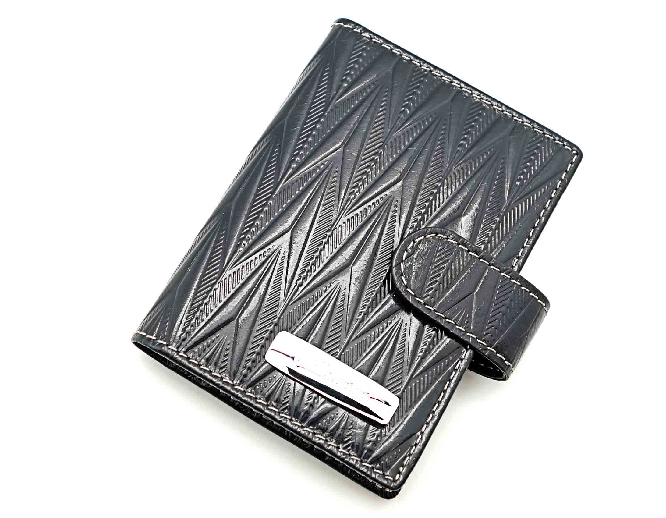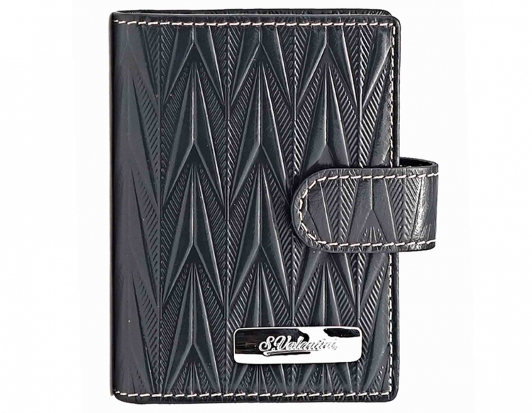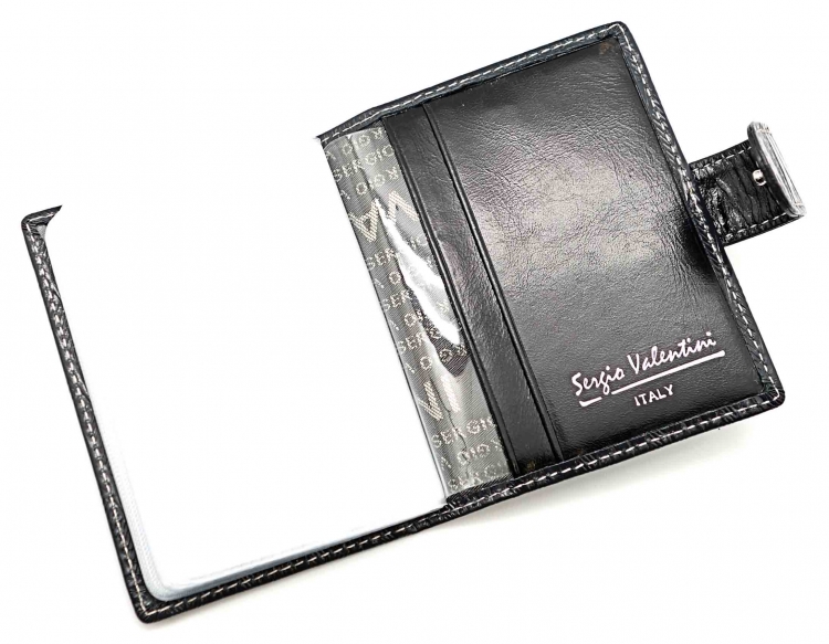 Изготовлено из высококачественной кожи тёмно-синего цвета. Размер 8 х 10,5 см. Закрывается на хлястик с кнопкой. Внутри: 30 прозрачных пластиковых файла для карточек, текстильная подкладка с логотипом и прозрачный захват на левой створке, кожаный захват и кармашек на правой створке.