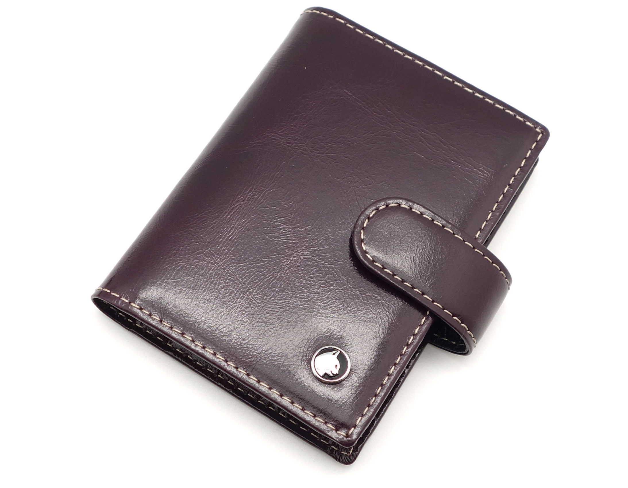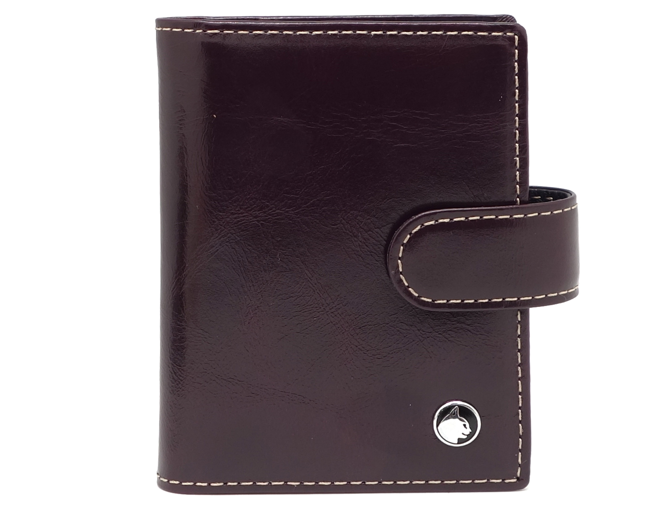 Размер 8 х 10,5 см. Закрывается на хлястик с кнопкой. Внутри: 30 прозрачных пластиковых файла для карточек, текстильная подкладка с логотипом и прозрачный захват на левой створке, кожаный захват и кармашек на правой створке.