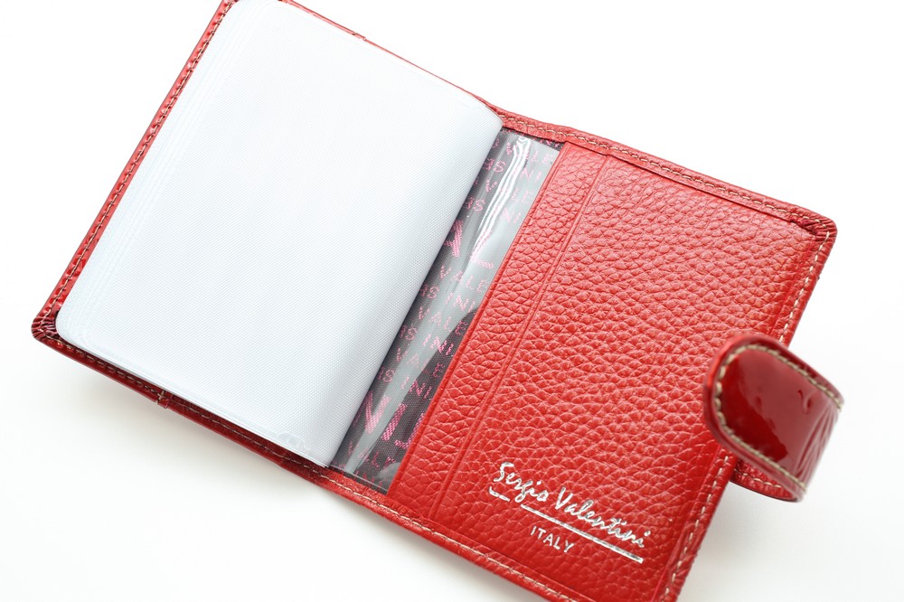 Размер 8 х 10,5 см. Закрывается на хлястик с кнопкой. Внутри: 30 прозрачных пластиковых файла для карточек, текстильная подкладка с логотипом и прозрачный захват на левой створке, кожаный захват и кармашек на правой створке.
