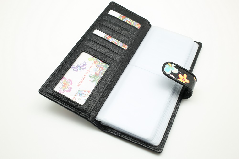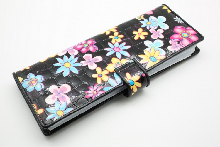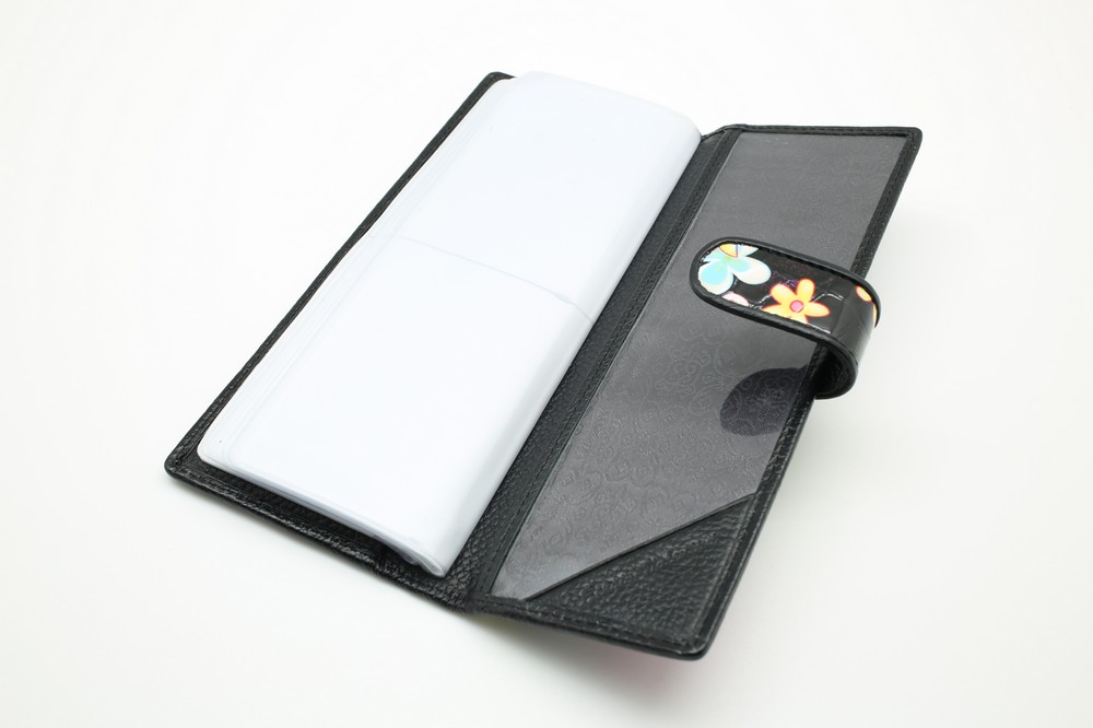 Размер 8.5 х 20 см. Закрывается на хлястик с кнопкой. Внутри 60 прозрачных файлов для визиток.
