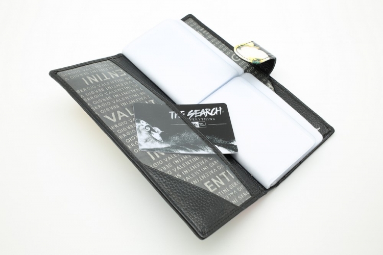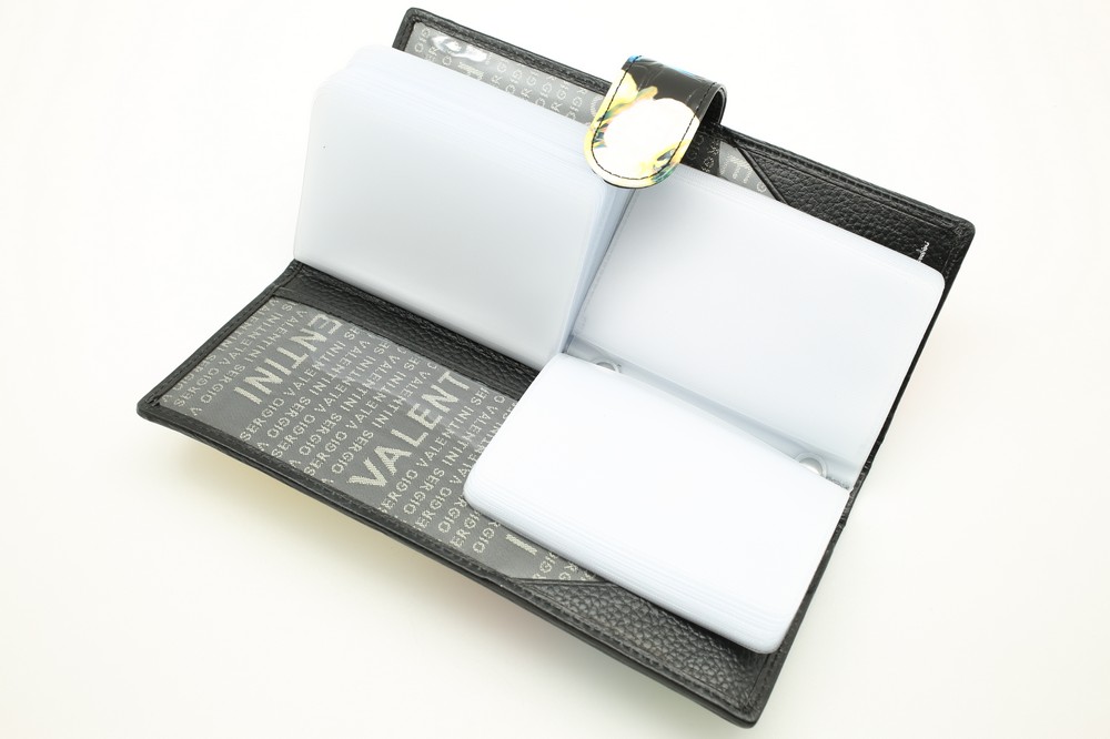 Размер 8.5 х 20 см. Закрывается на хлястик с кнопкой. Внутри 60 прозрачных файлов для визиток.
