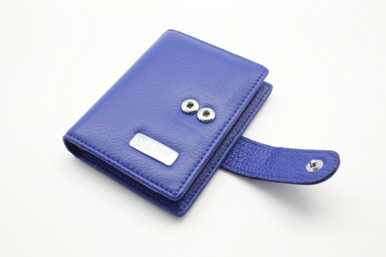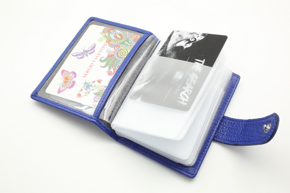 Размер 8 х 10,5 см. Закрывается на хлястик с кнопкой. Внутри: удобные прозрачные пластиковые файлы на 28 карточек, текстильная подкладка и прозрачный захват на левой створке, кожаный захват и кармашек на правой створке.