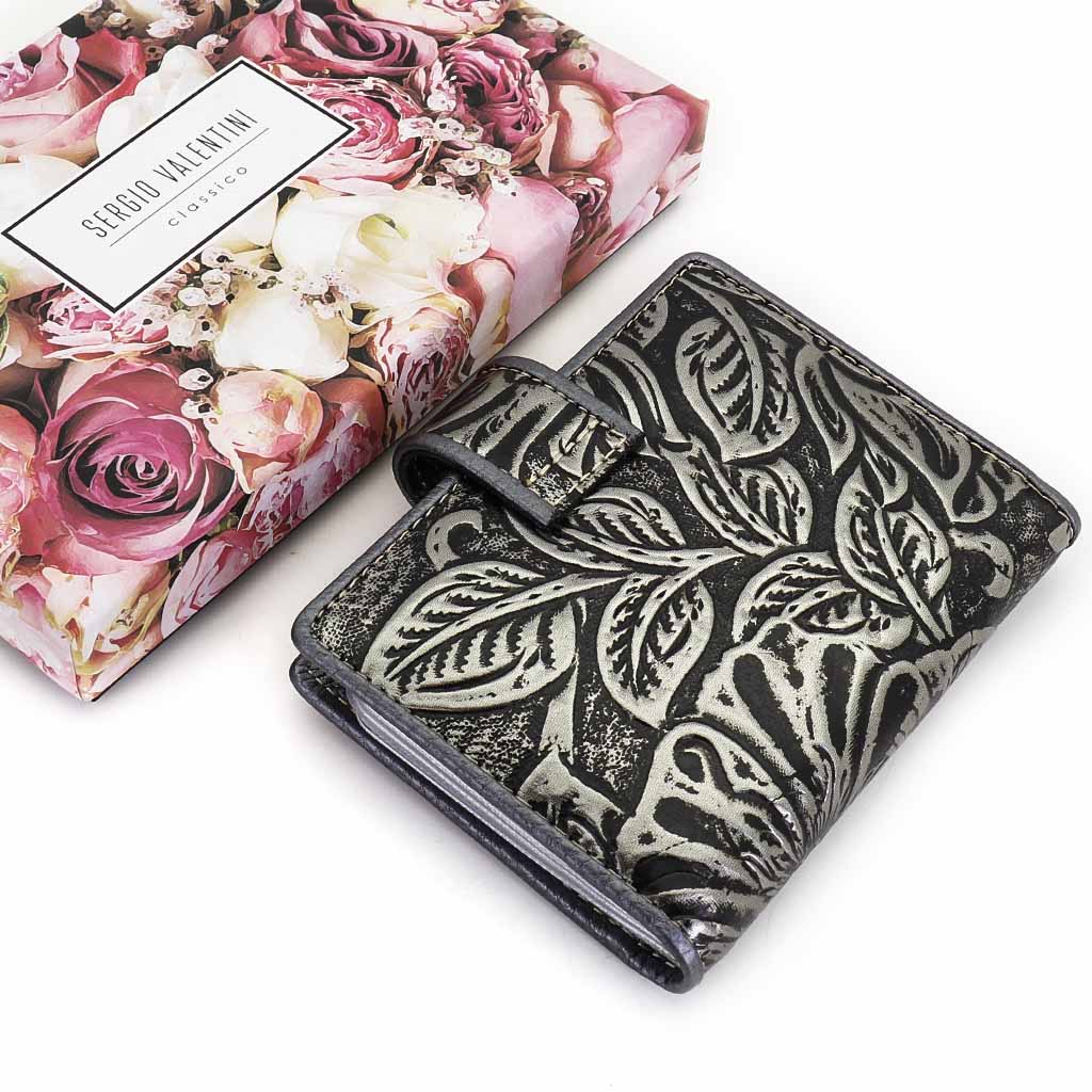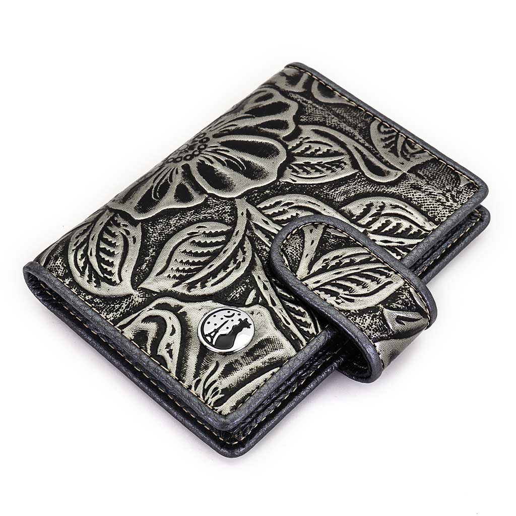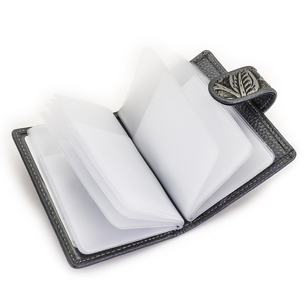 Размер 8 х 10,5 см. Закрывается на хлястик с кнопкой. Внутри: удобные прозрачные пластиковые файлы на 28 карточек, текстильная подкладка и прозрачный захват на левой створке, кожаный захват и кармашек на правой створке.