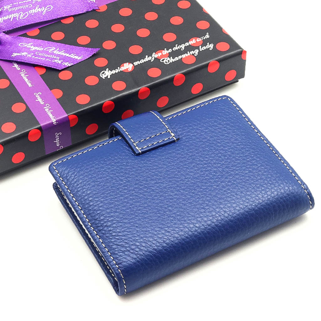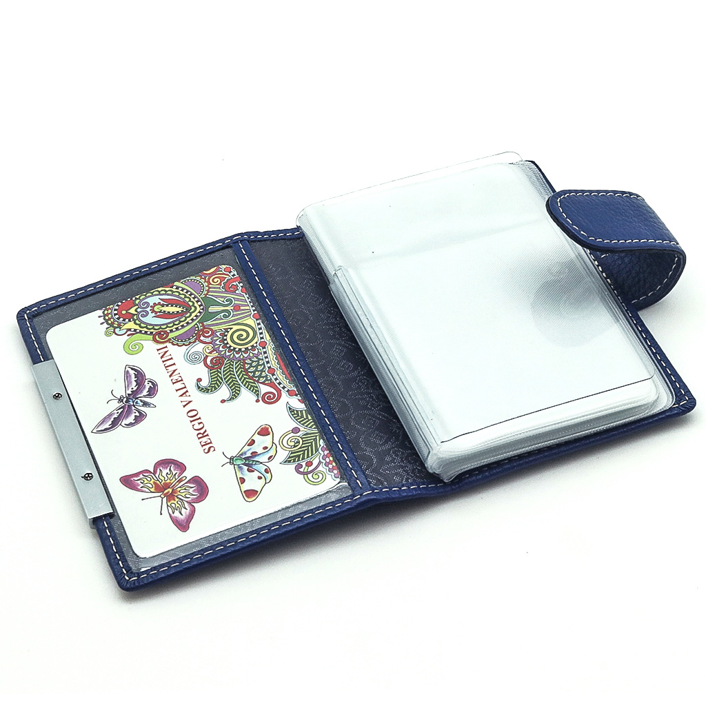 Размер 8 х 10,5 см. Закрывается на хлястик с кнопкой. Внутри: удобные прозрачные пластиковые файлы на 28 карточек, текстильная подкладка и прозрачный захват на левой створке, кожаный захват и кармашек на правой створке.