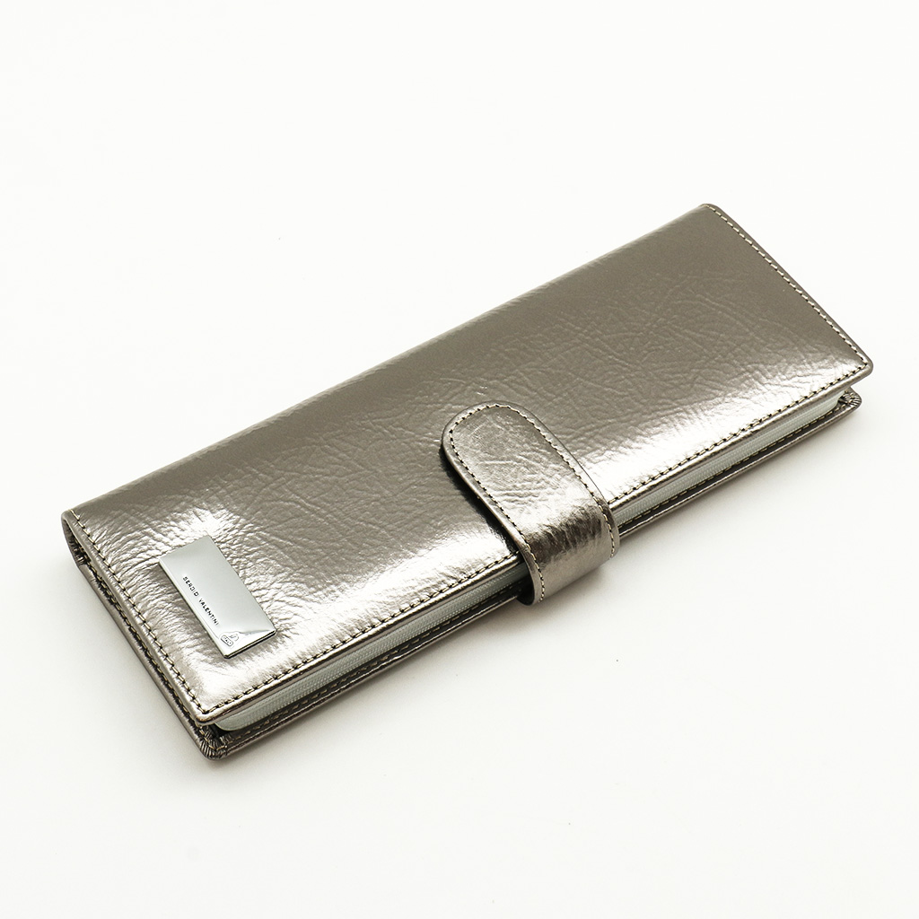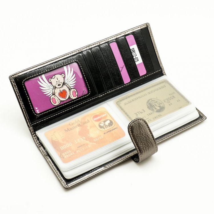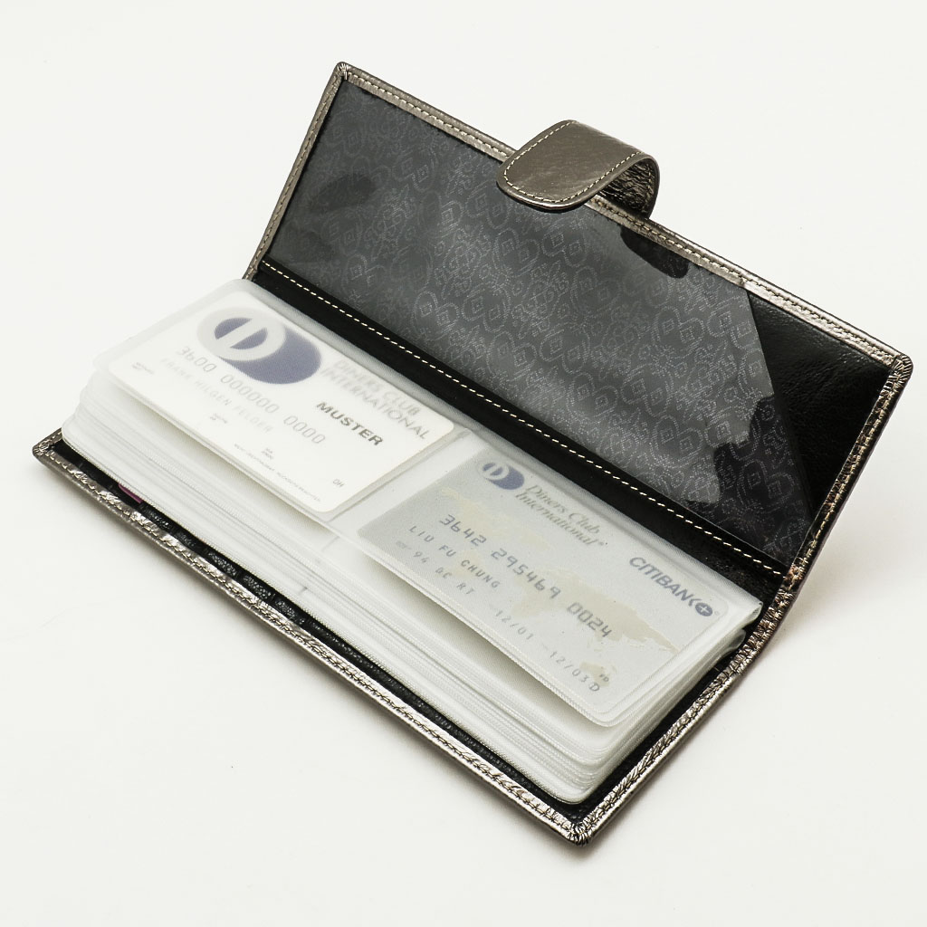 Размер 8 х 20 см. Альбом с прозрачными файлами на 40 визитных карточек. Закрывается хлястиком с кнопкой. На внутренней стороне левой створки продольный карман, семь кармашков для карточек и прозрачное окошко для фотографии. На правой створке- прозрачный карман и угловой кармашек.