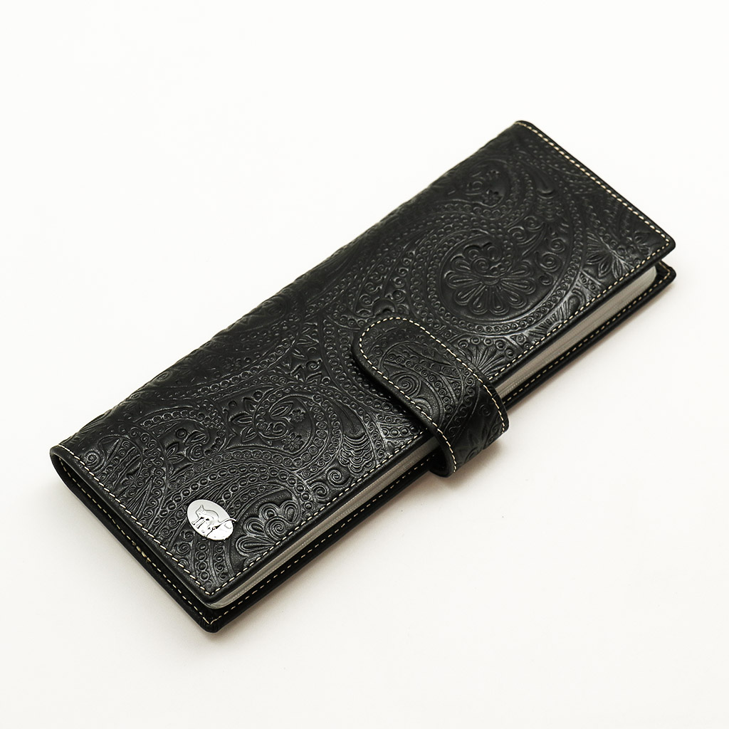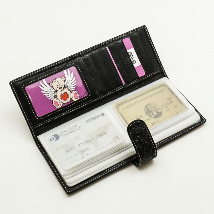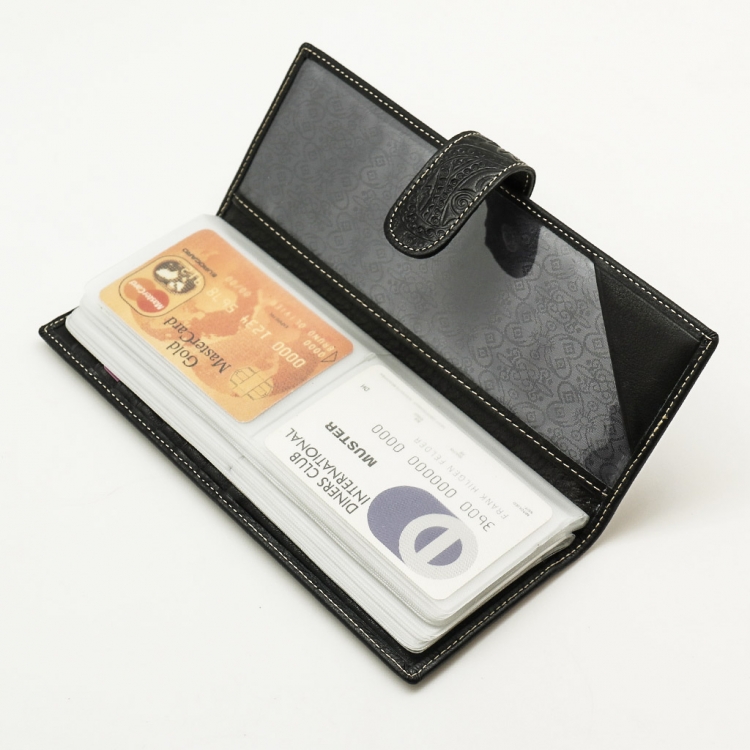 Размер 8 х 20 см. Альбом с прозрачными файлами на 40 визитных карточек. Закрывается хлястиком с кнопкой. На внутренней стороне левой створки продольный карман, семь кармашков для карточек и прозрачное окошко для фотографии. На правой створке- прозрачный карман и угловой кармашек.