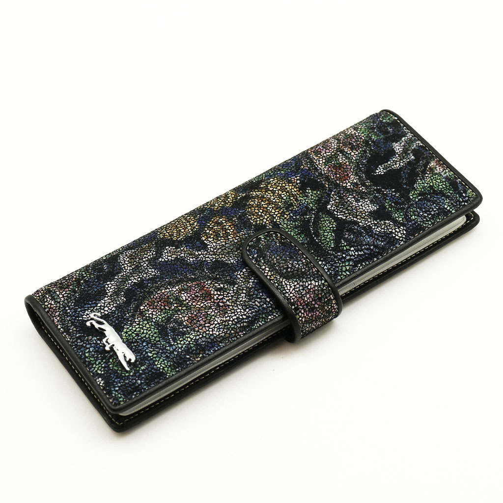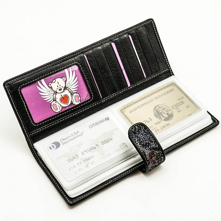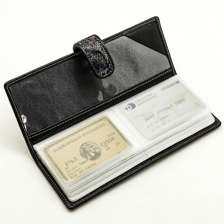 Размер 8 х 20 см. Альбом с прозрачными файлами на 40 визитных карточек. Закрывается хлястиком с кнопкой. На внутренней стороне левой створки продольный карман, семь кармашков для карточек и прозрачное окошко для фотографии. На правой створке- прозрачный карман и угловой кармашек.