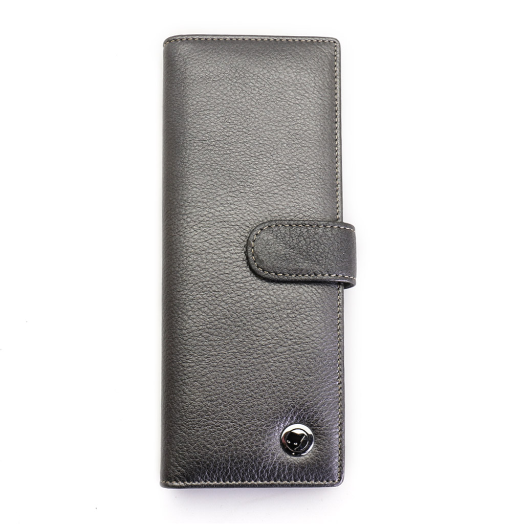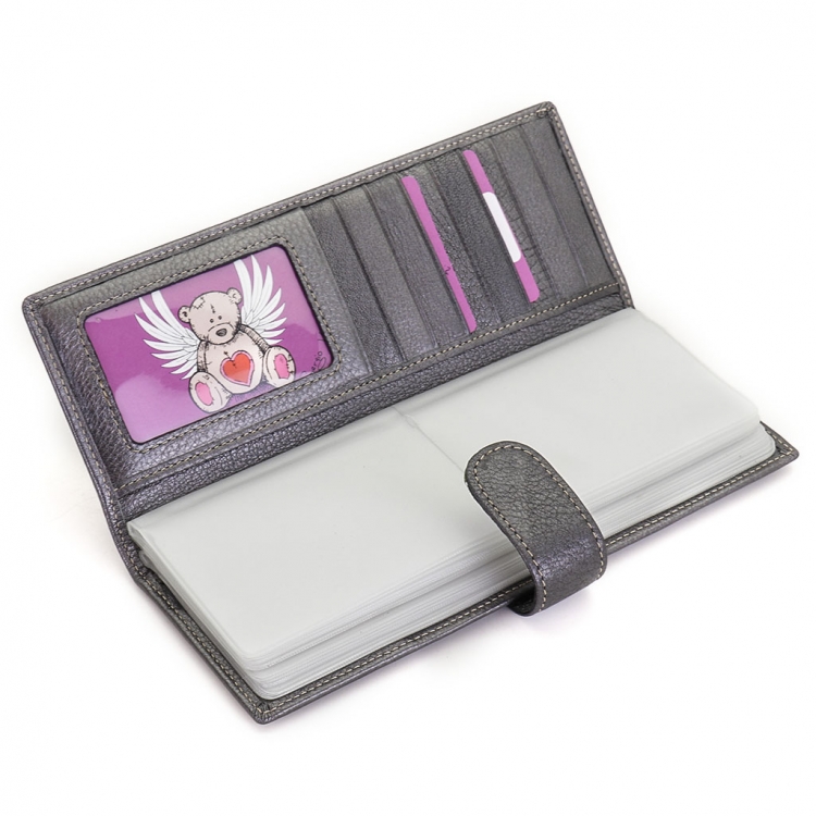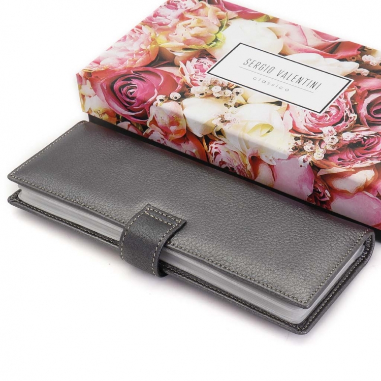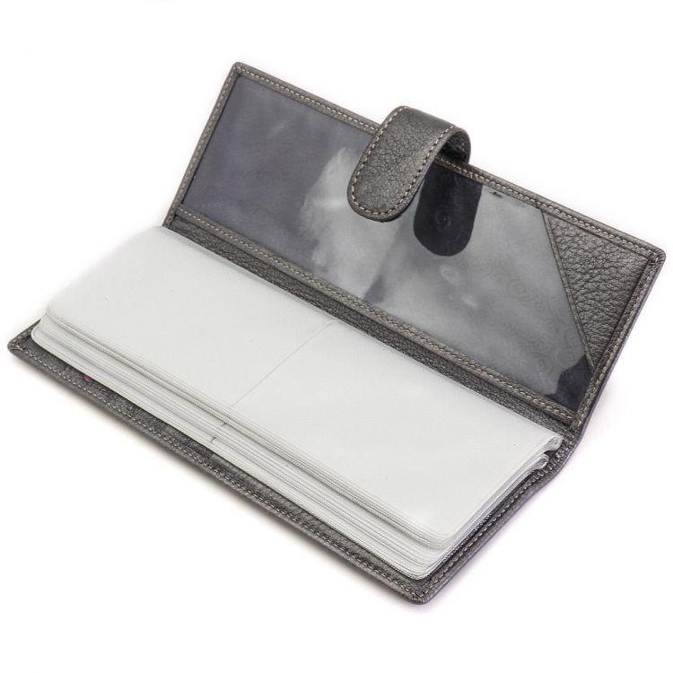 Размер 8 х 20 см. Альбом с прозрачными файлами на 40 визитных карточек. Закрывается хлястиком с кнопкой. На внутренней стороне левой створки продольный карман, семь кармашков для карточек и прозрачное окошко для фотографии. На правой створке- прозрачный карман и угловой кармашек.