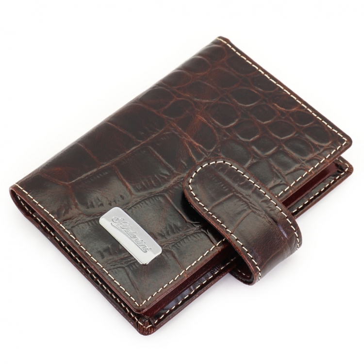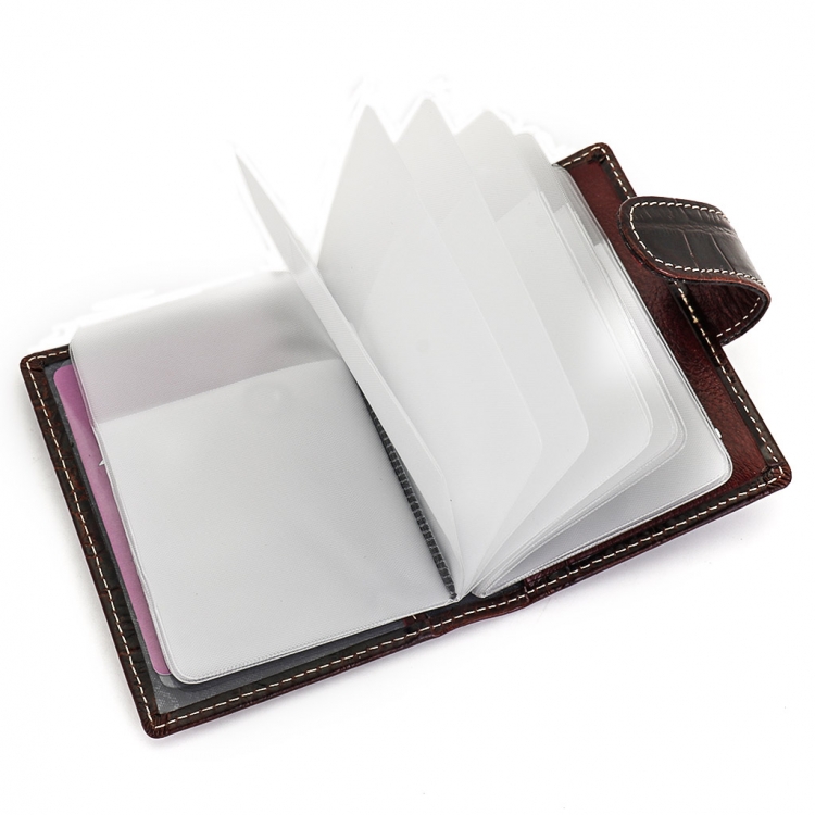 Размер 8 х 10,5 см. Закрывается на хлястик с кнопкой. Внутри: удобные прозрачные пластиковые файлы на 28 карточек, текстильная подкладка и прозрачный захват на левой створке, кожаный захват и кармашек на правой створке.