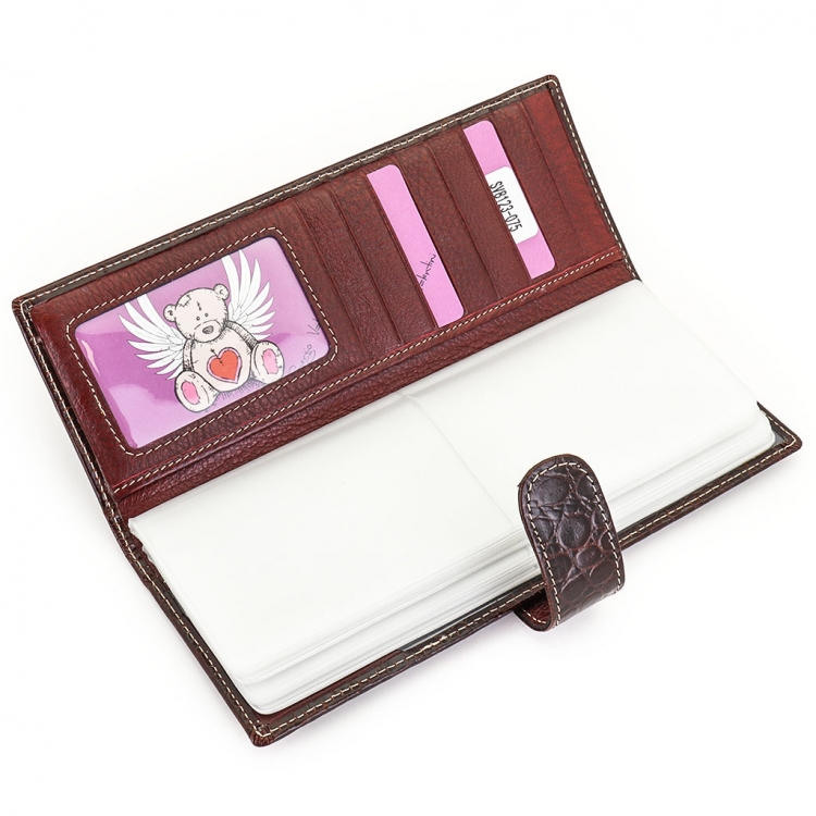 Размер 8 х 20 см. Альбом с прозрачными файлами на 40 визитных карточек. Закрывается хлястиком с кнопкой. На внутренней стороне левой створки продольный карман, семь кармашков для карточек и прозрачное окошко для фотографии. На правой створке- прозрачный карман и угловой кармашек.