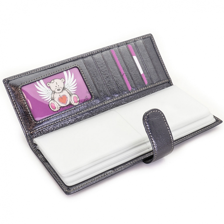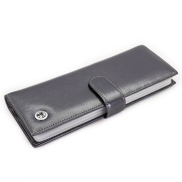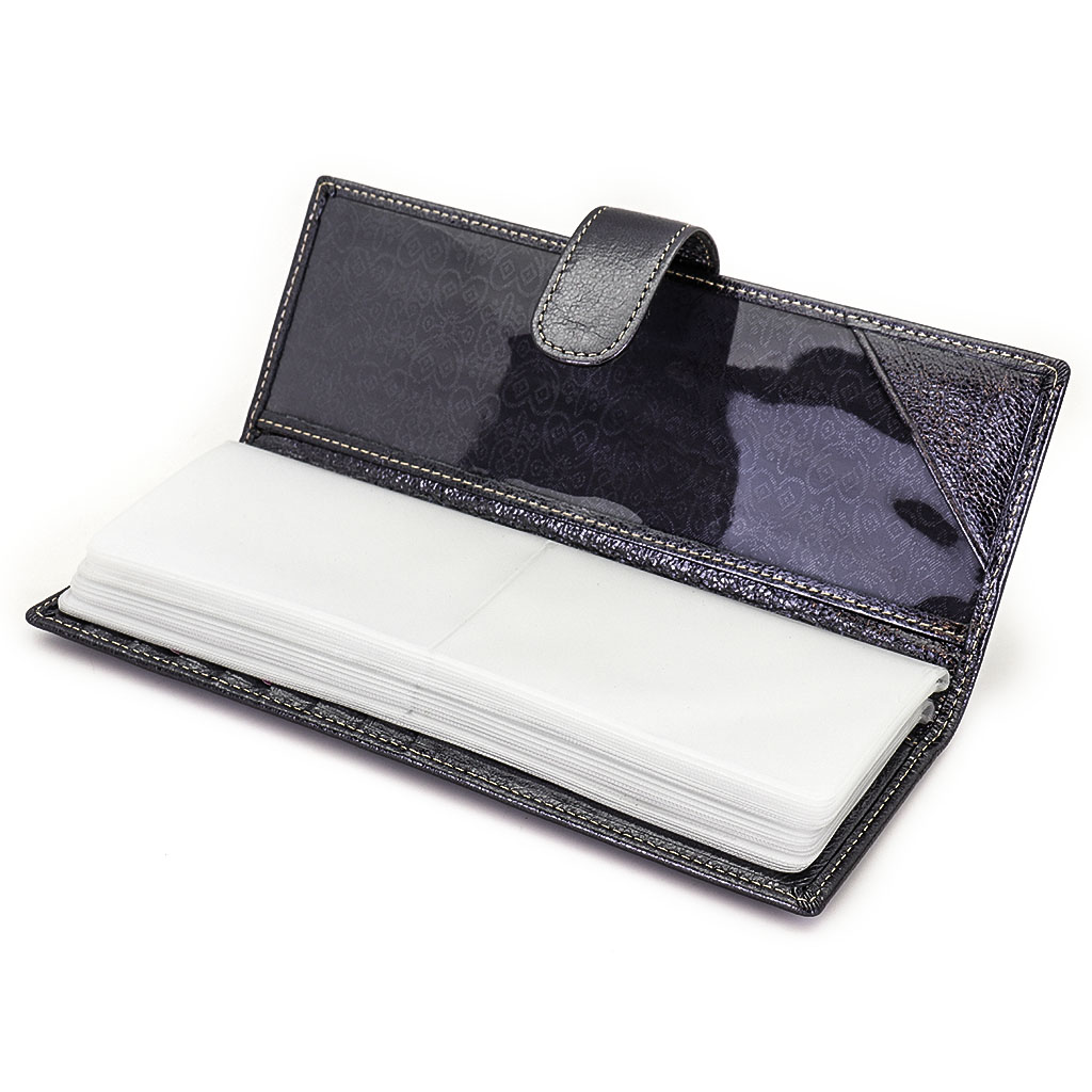 Размер 8 х 20 см. Альбом с прозрачными файлами на 40 визитных карточек. Закрывается хлястиком с кнопкой. На внутренней стороне левой створки продольный карман, семь кармашков для карточек и прозрачное окошко для фотографии. На правой створке- прозрачный карман и угловой кармашек.