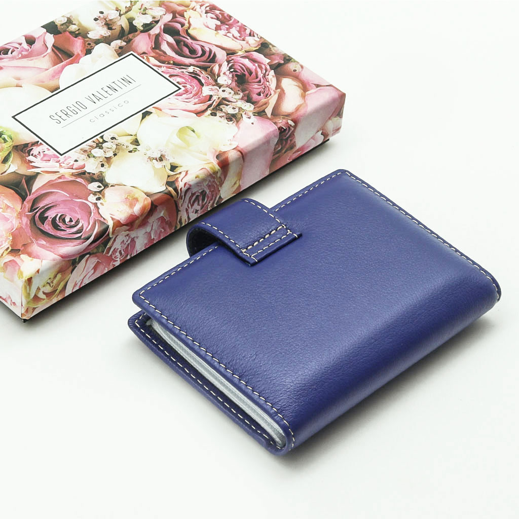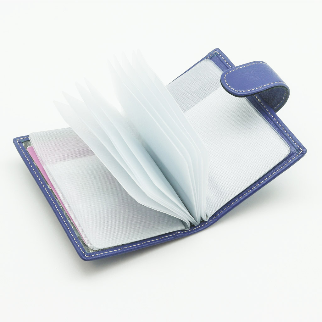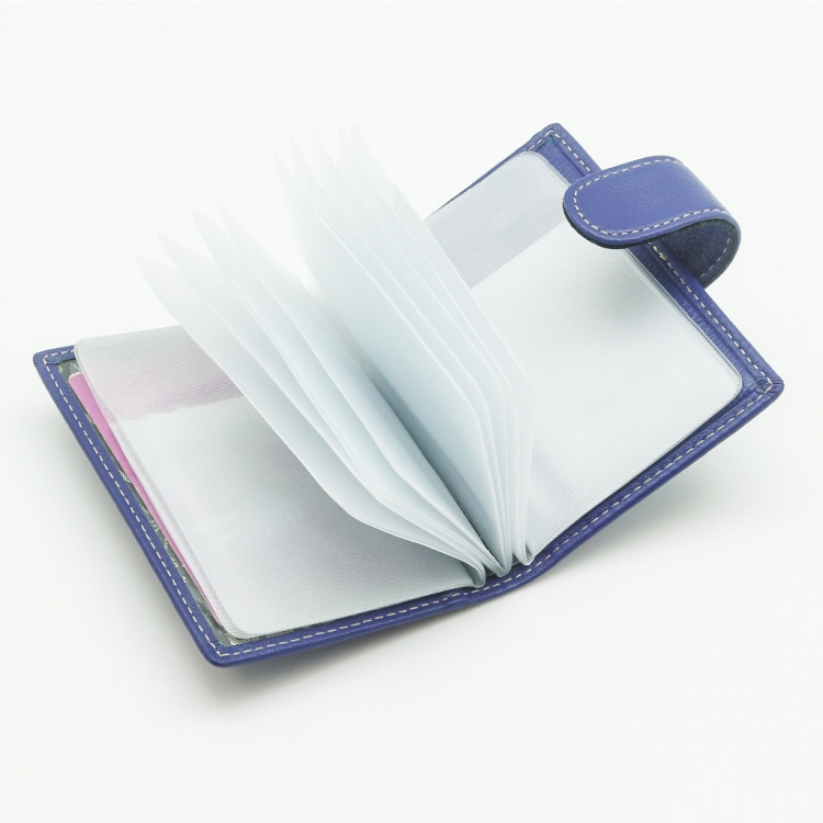 Размер 8 х 10,5 см. Закрывается на хлястик с кнопкой. Внутри: удобные прозрачные пластиковые файлы на 28 карточек, текстильная подкладка и прозрачный захват на левой створке, кожаный захват и кармашек на правой створке.