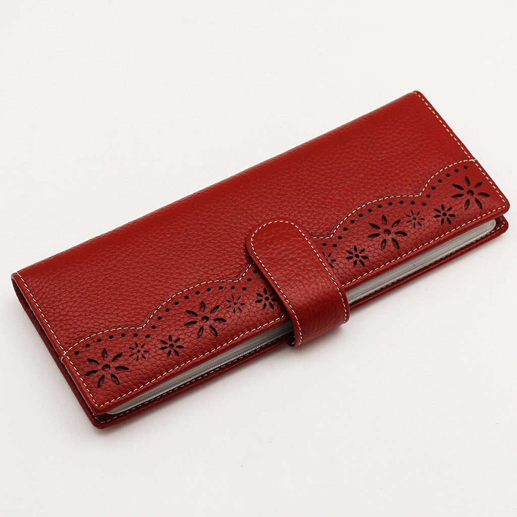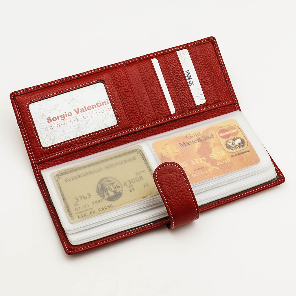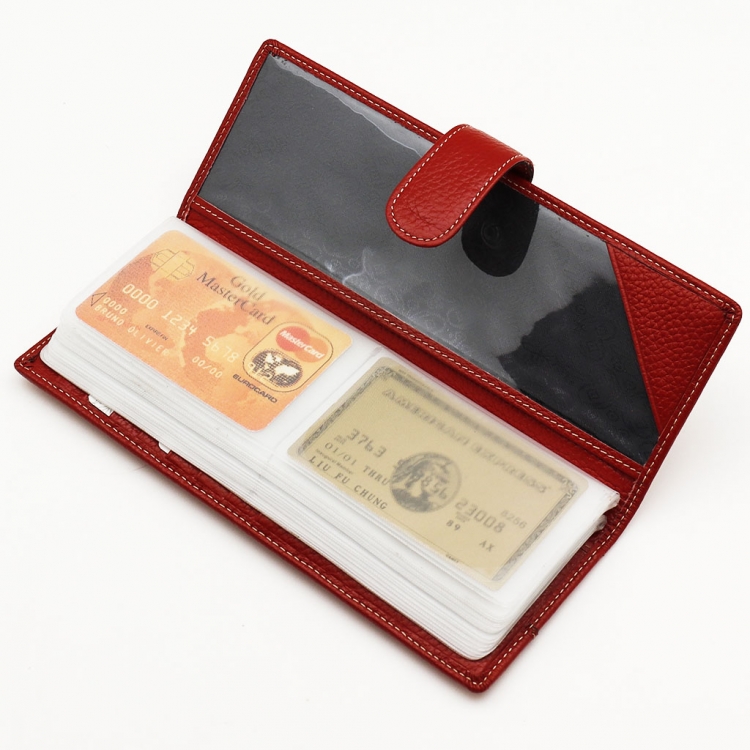 Размер 8 х 20 см. Альбом с прозрачными файлами на 40 визитных карточек. Закрывается хлястиком с кнопкой. На внутренней стороне левой створки продольный карман, семь кармашков для карточек и прозрачное окошко для фотографии. На правой створке- прозрачный карман и угловой кармашек.
