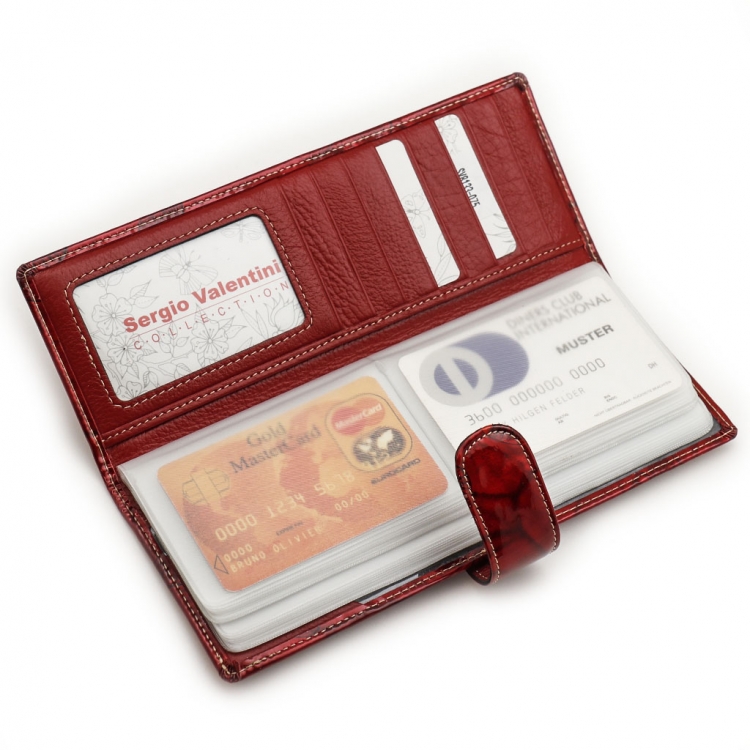 Размер 8 х 20 см. Альбом с прозрачными файлами на 40 визитных карточек. Закрывается хлястиком с кнопкой. На внутренней стороне левой створки продольный карман, семь кармашков для карточек и прозрачное окошко для фотографии. На правой створке- прозрачный карман и угловой кармашек.