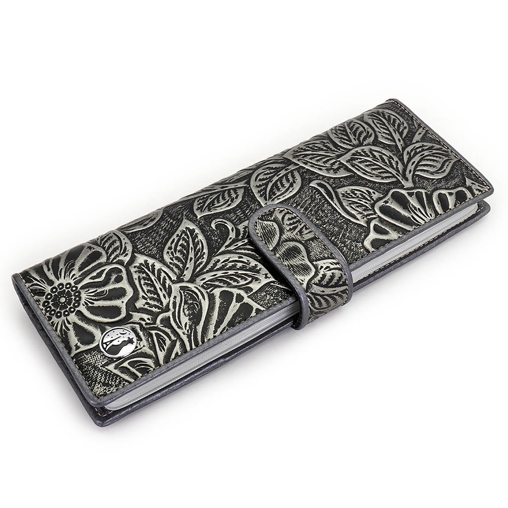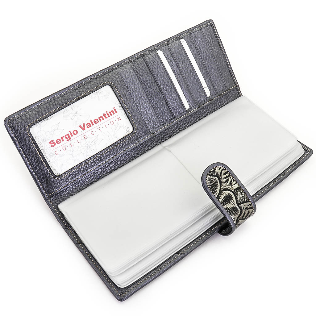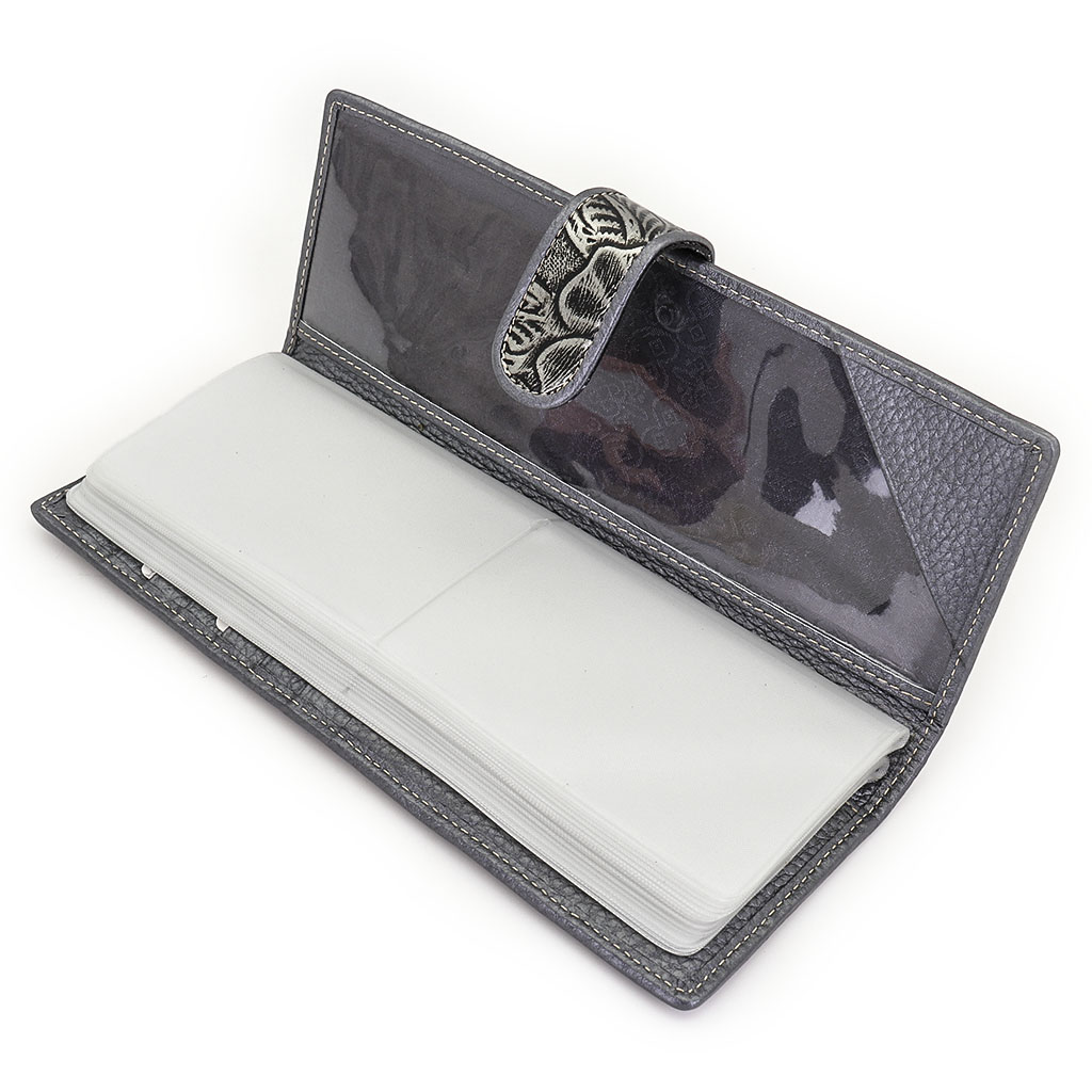 Размер 8 х 20 см. Альбом с прозрачными файлами на 40 визитных карточек. Закрывается хлястиком с кнопкой. На внутренней стороне левой створки продольный карман, семь кармашков для карточек и прозрачное окошко для фотографии. На правой створке- прозрачный карман и угловой кармашек.