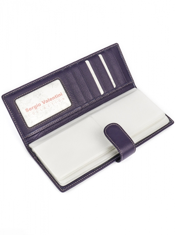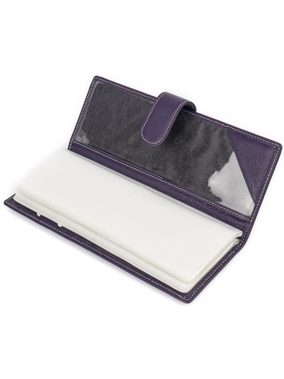 Размер 8 х 20 см. Альбом с прозрачными файлами на 40 визитных карточек. Закрывается хлястиком с кнопкой. На внутренней стороне левой створки продольный карман, семь кармашков для карточек и прозрачное окошко для фотографии. На правой створке- прозрачный карман и угловой кармашек.