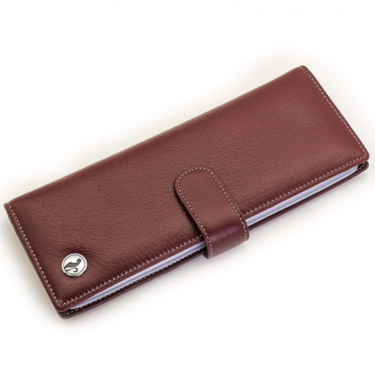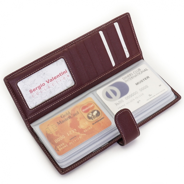 Размер 8 х 20 см. Альбом с прозрачными файлами на 40 визитных карточек. Закрывается хлястиком с кнопкой. На внутренней стороне левой створки продольный карман, семь кармашков для карточек и прозрачное окошко для фотографии. На правой створке- прозрачный карман и угловой кармашек.