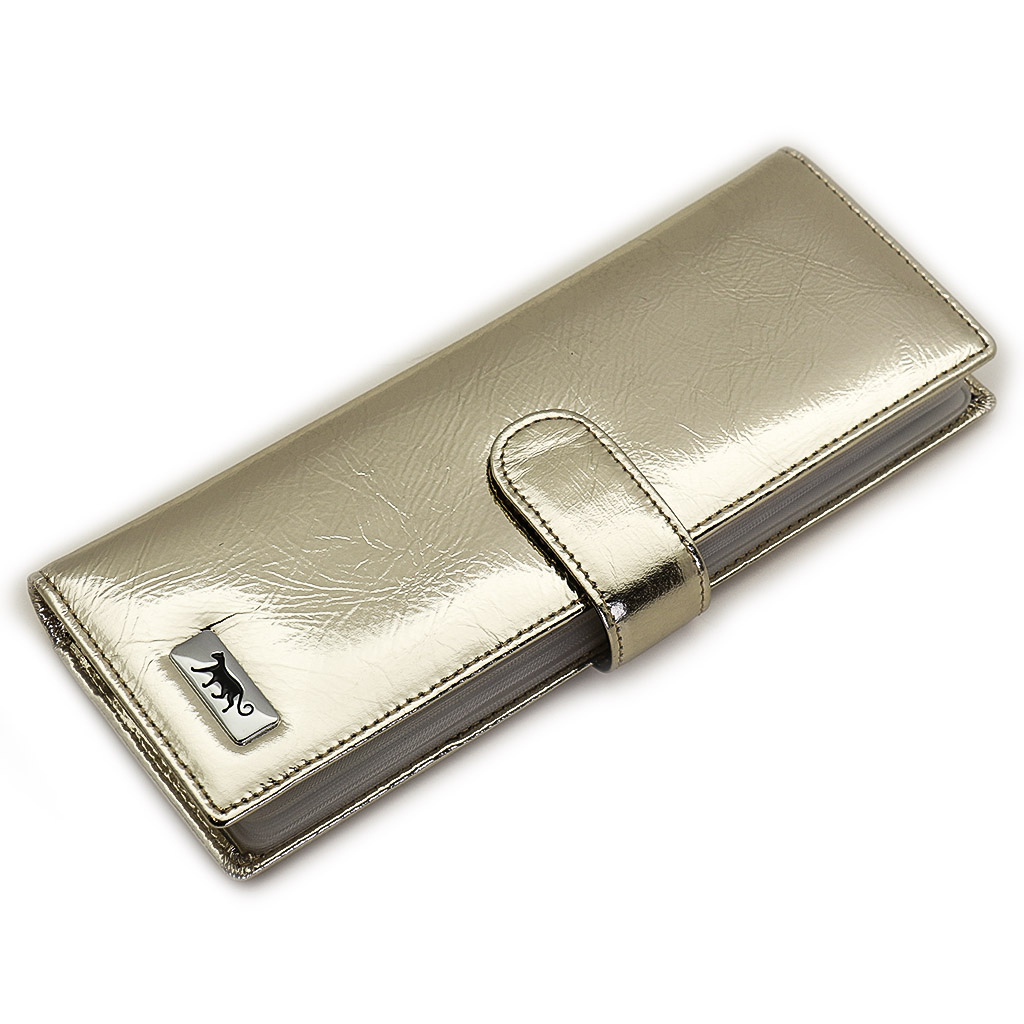 Размер 8 х 20 см. Альбом с прозрачными файлами на 40 визитных карточек. Закрывается хлястиком с кнопкой. На внутренней стороне левой створки продольный карман, семь кармашков для карточек и прозрачное окошко для фотографии. На правой створке- прозрачный карман и угловой кармашек.