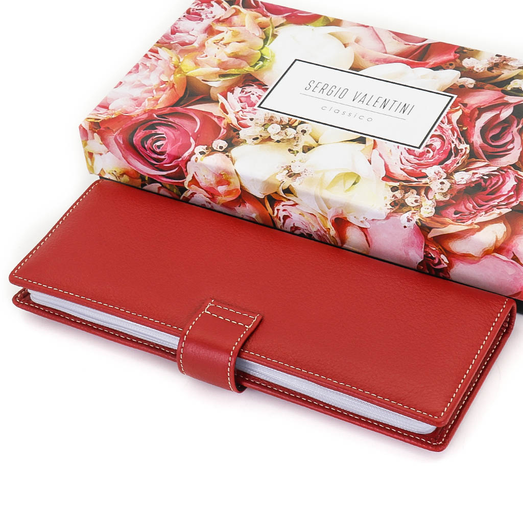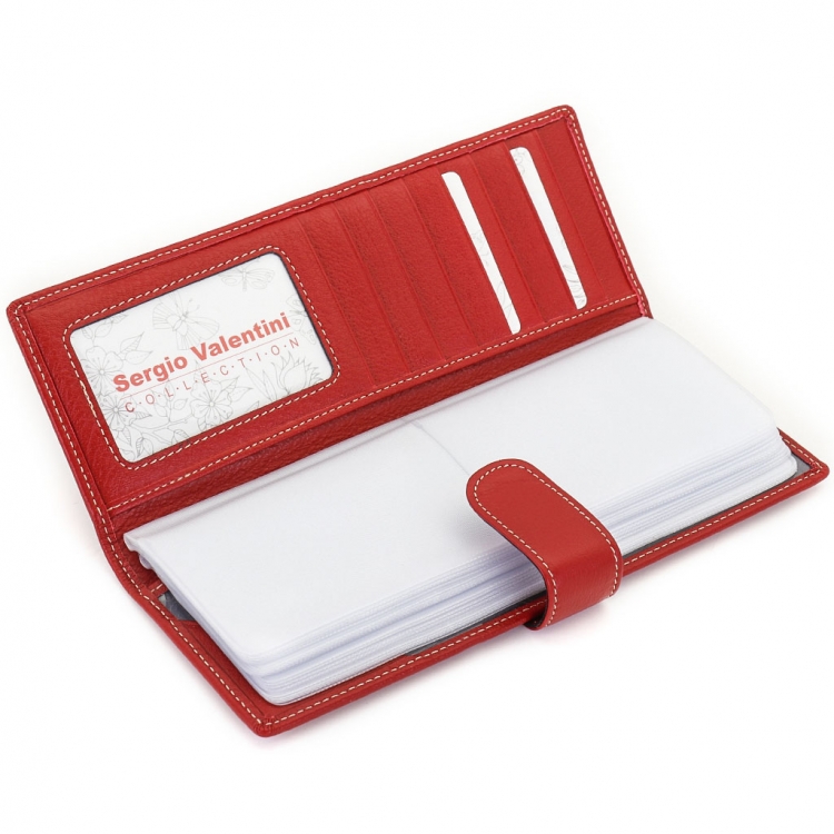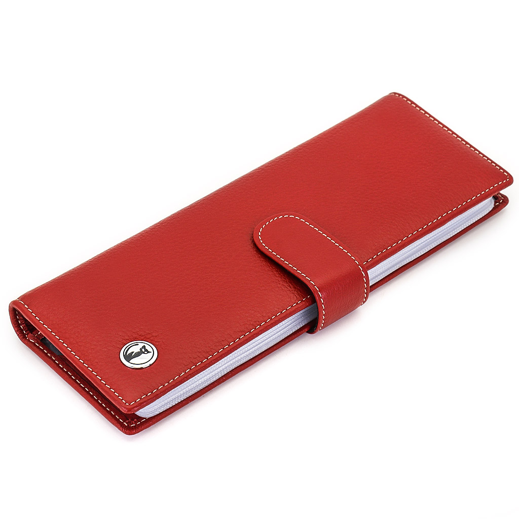 Размер 8 х 20 см. Альбом с прозрачными файлами на 40 визитных карточек. Закрывается хлястиком с кнопкой. На внутренней стороне левой створки продольный карман, семь кармашков для карточек и прозрачное окошко для фотографии. На правой створке- прозрачный карман и угловой кармашек.