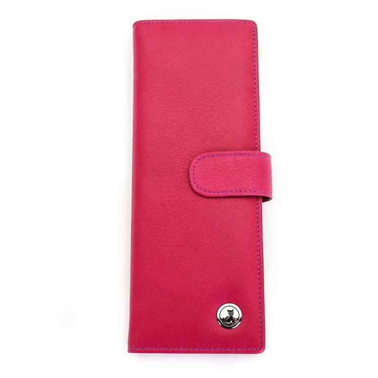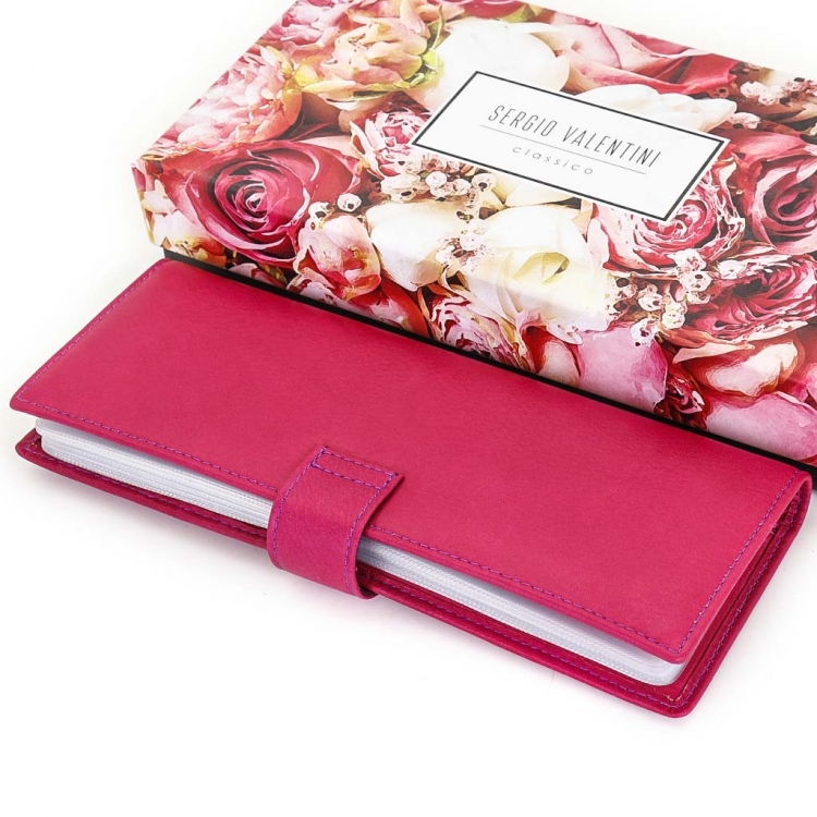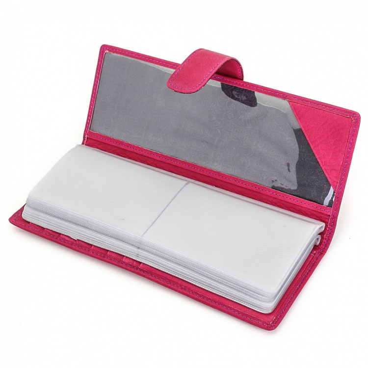 Размер 8 х 20 см. Альбом с прозрачными файлами на 40 визитных карточек. Закрывается хлястиком с кнопкой. На внутренней стороне левой створки продольный карман, семь кармашков для карточек и прозрачное окошко для фотографии. На правой створке- прозрачный карман и угловой кармашек.