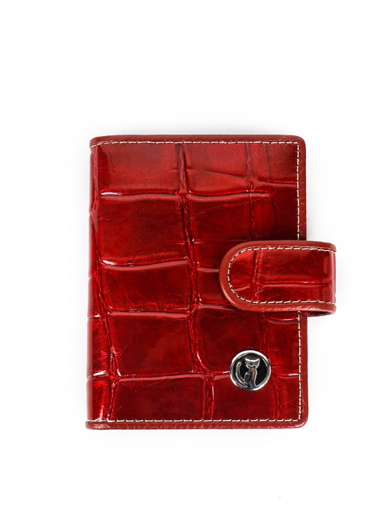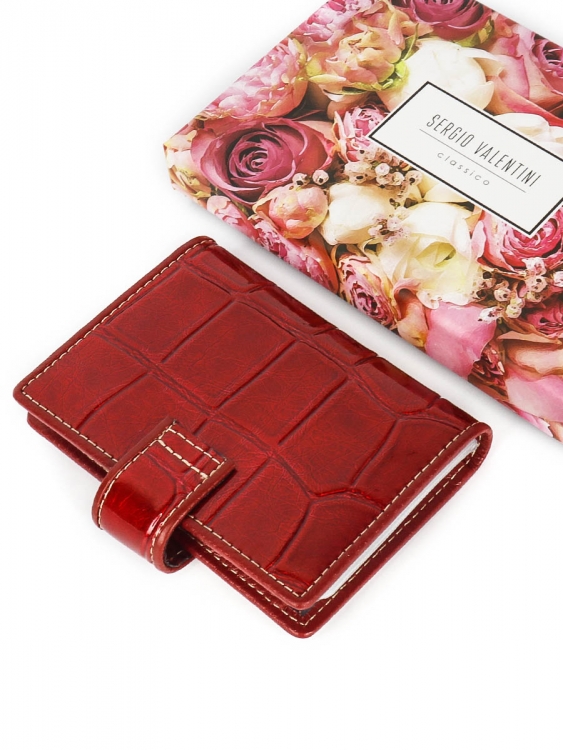 Размер 8 х 10,5 см. Закрывается на хлястик с кнопкой. Внутри: удобные прозрачные пластиковые файлы на 28 карточек, текстильная подкладка и прозрачный захват на левой створке, кожаный захват и кармашек на правой створке.